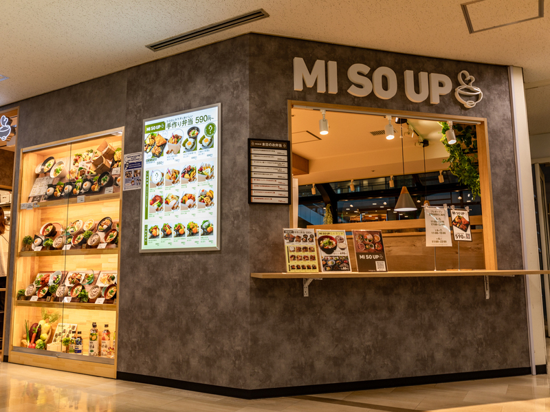 | 新業態の店舗展開 | ≪味噌やお惣菜にこだわった定食レストラン≫ 「具だくさんお味噌汁でからだアップ!」をテーマにした ヘルシーな定食が楽しめる「MI SO UP」(ミソップ)。 ランチ、テイクアウト、ディナータイムでも定食を提供する新業態の店舗開発も進めています! |