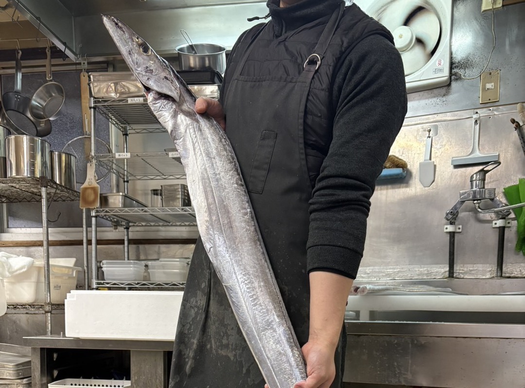鹿児島から立派な太刀魚が届きました。思わず「でかっ…!」と声が出るほどのサイズで、持ち上げると銀色の体がきれいに光ります。ここまで大きい太刀魚はなかなか出会えないので、仕込みの段階からちょっとワクワク。