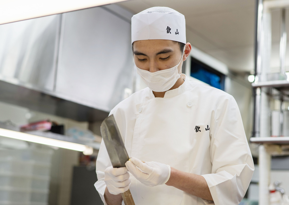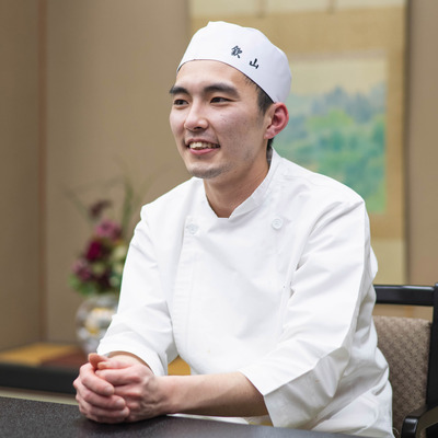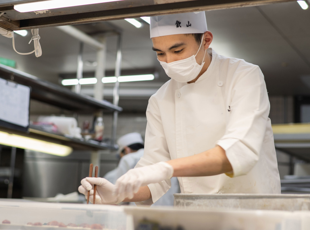 私は新卒で欽山に入社しました。和食の料理人を目指していたので、京都の割烹なども視野に入れ就職活動を行いましたが、扱う食材の素晴らしさや既製品などは一切使わず、魚なども1匹丸ごと仕入れて、すべて材料から手作りするところ、また高級料亭旅館としての佇まいにも惹かれ、入社を希望しました。中でも決め手となったのは、「誰でも基礎をしっかり身につけ、コツコツと積み上げていけば腕のよい料理人になれる。厳しいと思うけれど頑張りや」という料理長の深い愛情が感じられる温かい言葉。入社3年目の今は八寸場(懐石料理において、先付けや前菜の調理や盛り付け作業を担う)を任され徐々に経験を積んでいっているところです。