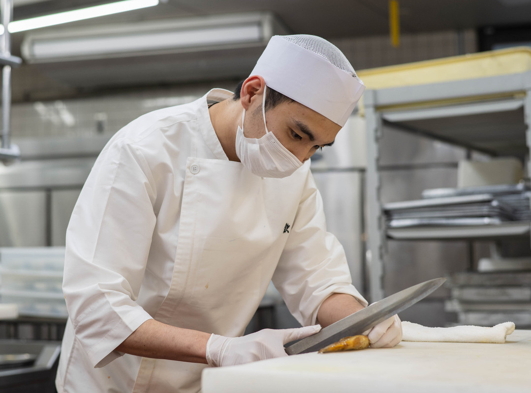 仕事は正直言って大変です。高級料亭旅館として、一流料亭に並ぶお料理をお客様にご提供するためには、味や料理の美しさはもちろん、提供する温度やタイミング、衛生面、安全面など、すべてにおいて完璧でなければいけません。そのためには些細なことであっても、ありとあらゆるところに目を配る必要があります。今はまだ食材の断面をいかに美しく、寸法のバラツキなく切れるかなどを追求しているところですが、何度も繰り返しやり続けていると、「こうすればいいのか」と思う瞬間が必ずやってきます。少しずつではありますが、日々の成長を感じることができるのがこの仕事の魅力。経験が少しずつ積み重なって、自分の自信へと変わっていきます。