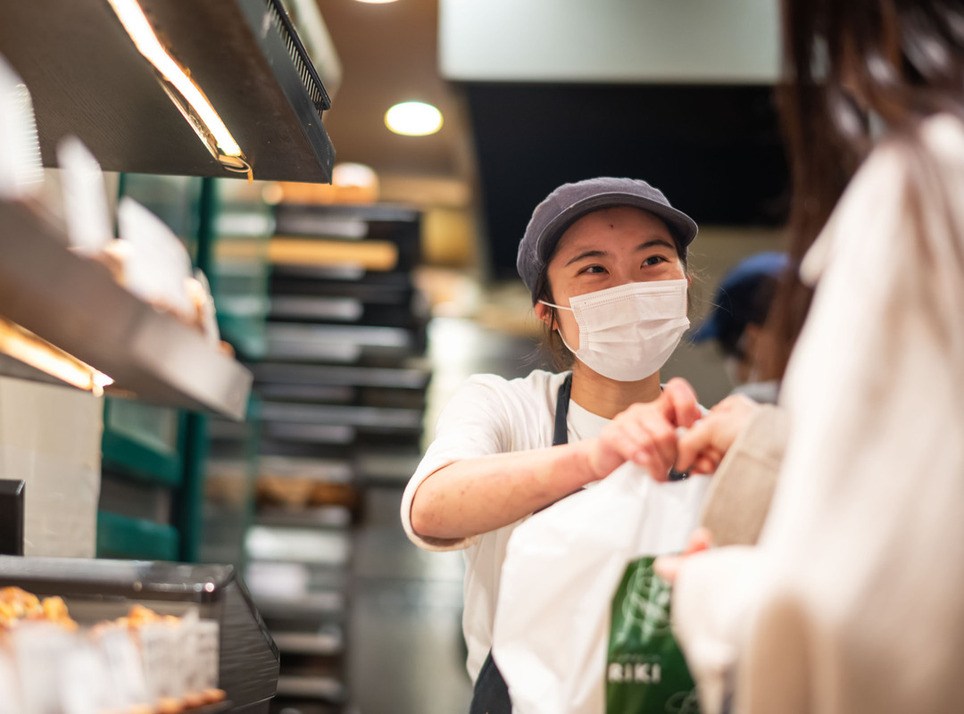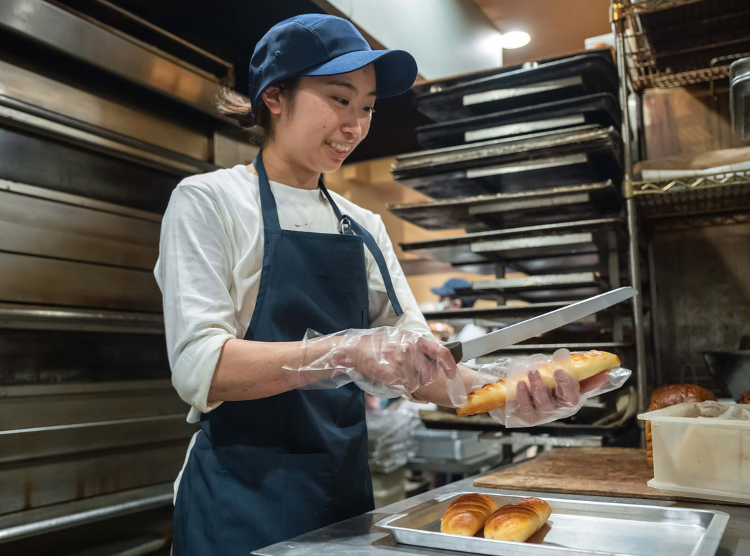 現在はおもに、販売と製造の補助を担当しています。レジ対応に加え、商品の売れ行きを見ながらパンの仕上げ・補充をするなど、店頭と厨房をつなぐ役割を担っています。日々多くのお客様が来店され、目の回るような忙しさですが、最近は自分の課題や目標を明確にするため、一日の振り返りを日課に。改善に向けての具体的な行動を決め、実践することで、以前よりも達成感や成長実感を得られるようになりました。できない自分に落ち込むことがあっても、あきらめずに続けていけば、少しずつでも前に進むことができます。私もまだまだ発展途上なので、一緒に頑張っていきましょう!