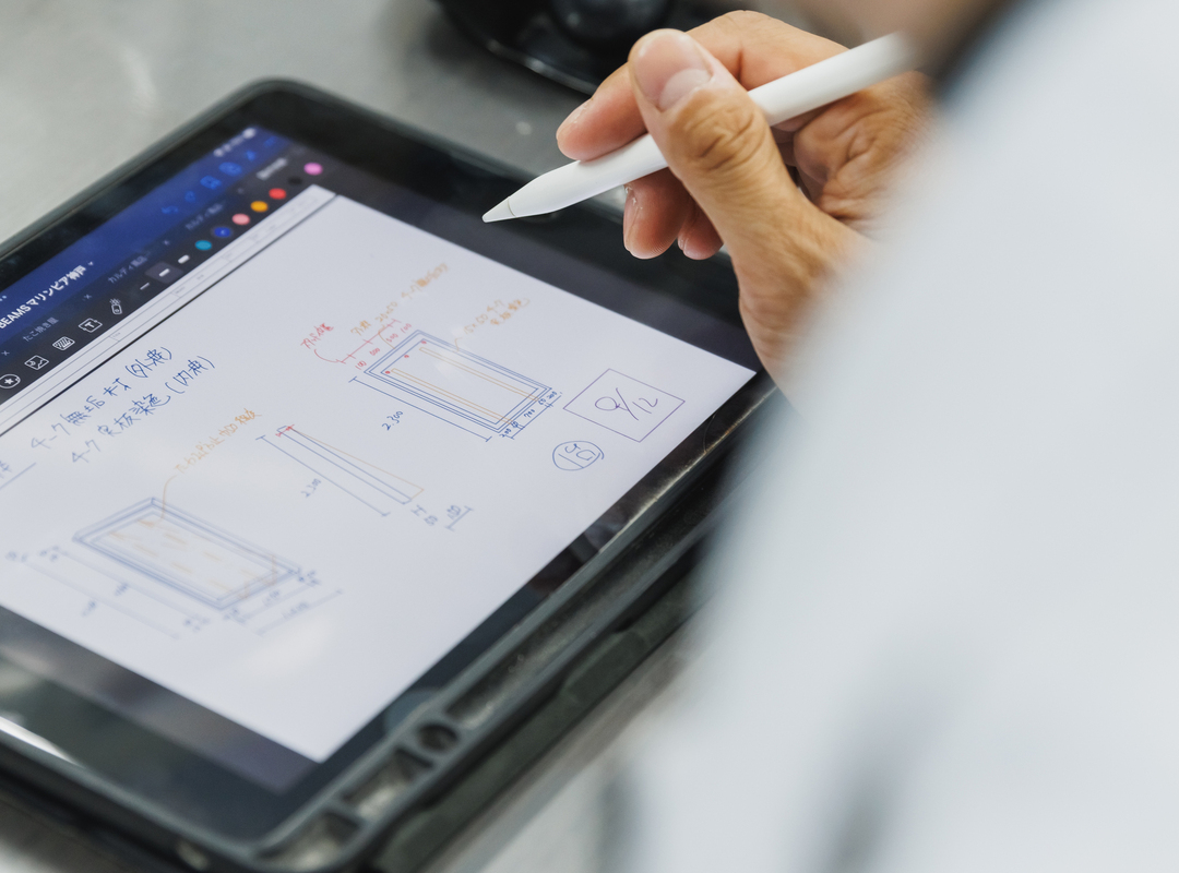 入社後に習得したスキルのひとつに、造作家具の指示書作成があります。先輩の手描きの指示書がとてもわかりやすく、私も同じ方法を取り入れるようになりました。まだ経験が浅いため頭を悩ませることも多いのですが、もともと絵を描くことは好きなので、楽しみながらスキルアップに努めています。