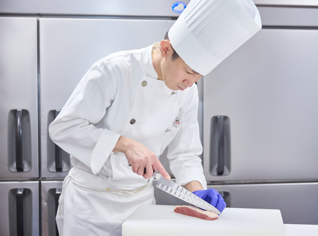 当ホテルでは、調理師として採用されると入社後すぐに現場に入ります。新人のスタッフには、盛り付けや食材の切り方などの技術を教えるだけでなく、一皿一皿に込めた思いを共有するよう努めています。