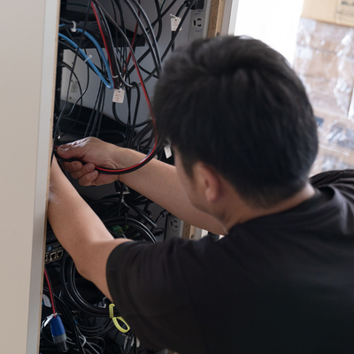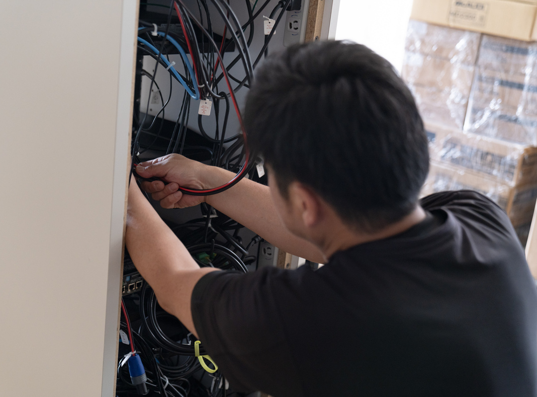 今は映像・音声系、LAN、特殊制御、電源関連のケーブルや、パネル等制作。ラック組配、また主に都内オフィスビルやイベント施設の現地施工も行っています。