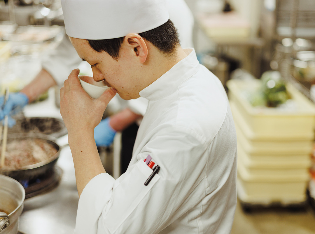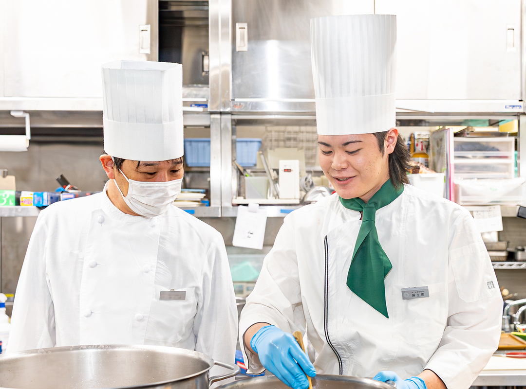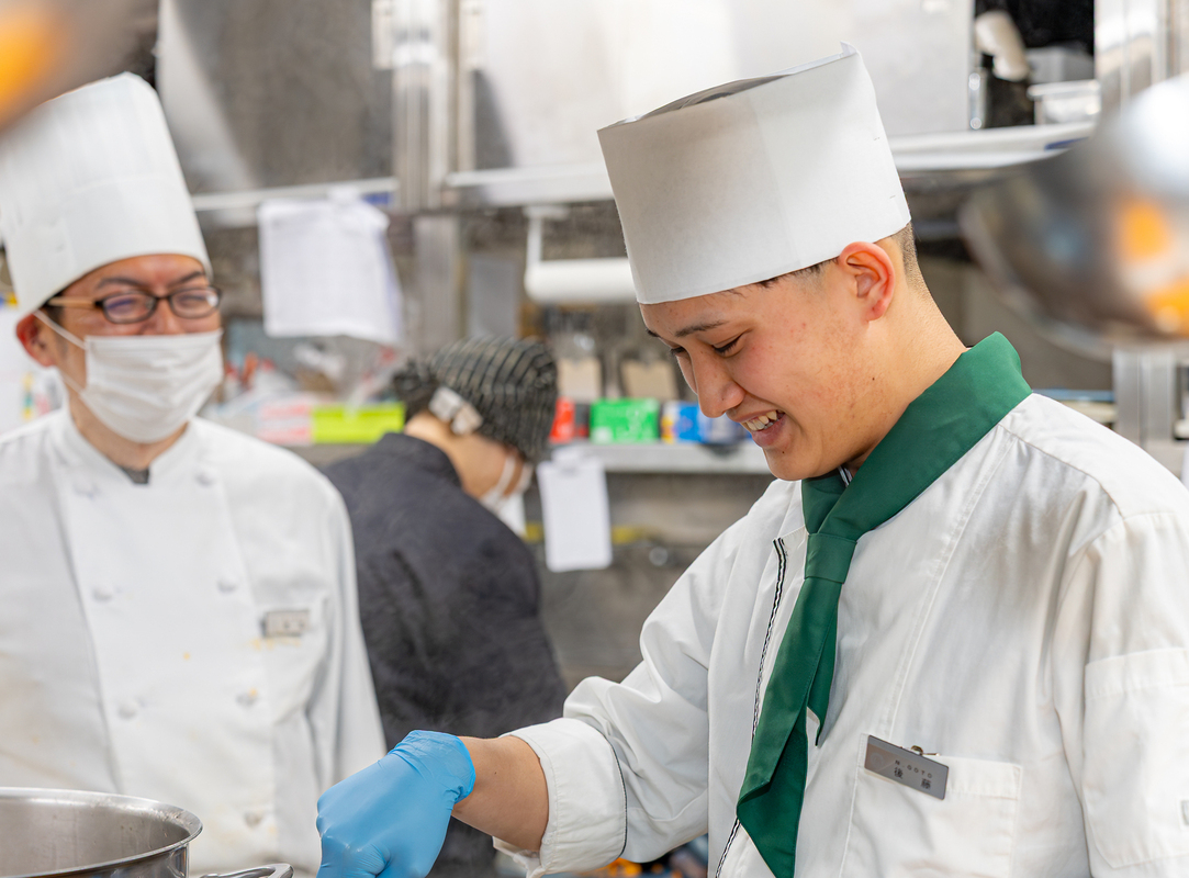 料理人を志す方にとってホテル本能寺は、会席料理と団体料理の両方を学べる点が魅力だと思います。新人でもまかない作りを通して、自分のアイデアを形にすることができますし、学生アルバイトとしてここで得た経験を糧に、管理栄養士になった人もいます。幅広い技術と経験を、ぎゅっと凝縮して身につけたい人には、おすすめの環境ですね。また働き方においても、私自身の苦い経験から、希望休は100%通すよう、シフト管理を徹底しています。みなさんには料理人として無限の可能性があります。そのチャレンジの第一歩を、ここで踏み出してみませんか?一緒に料理を楽しんでいきましょう!