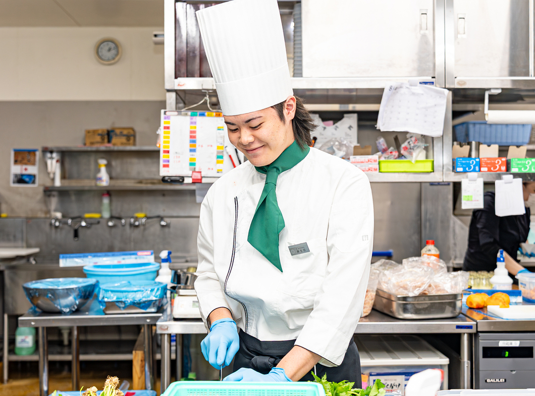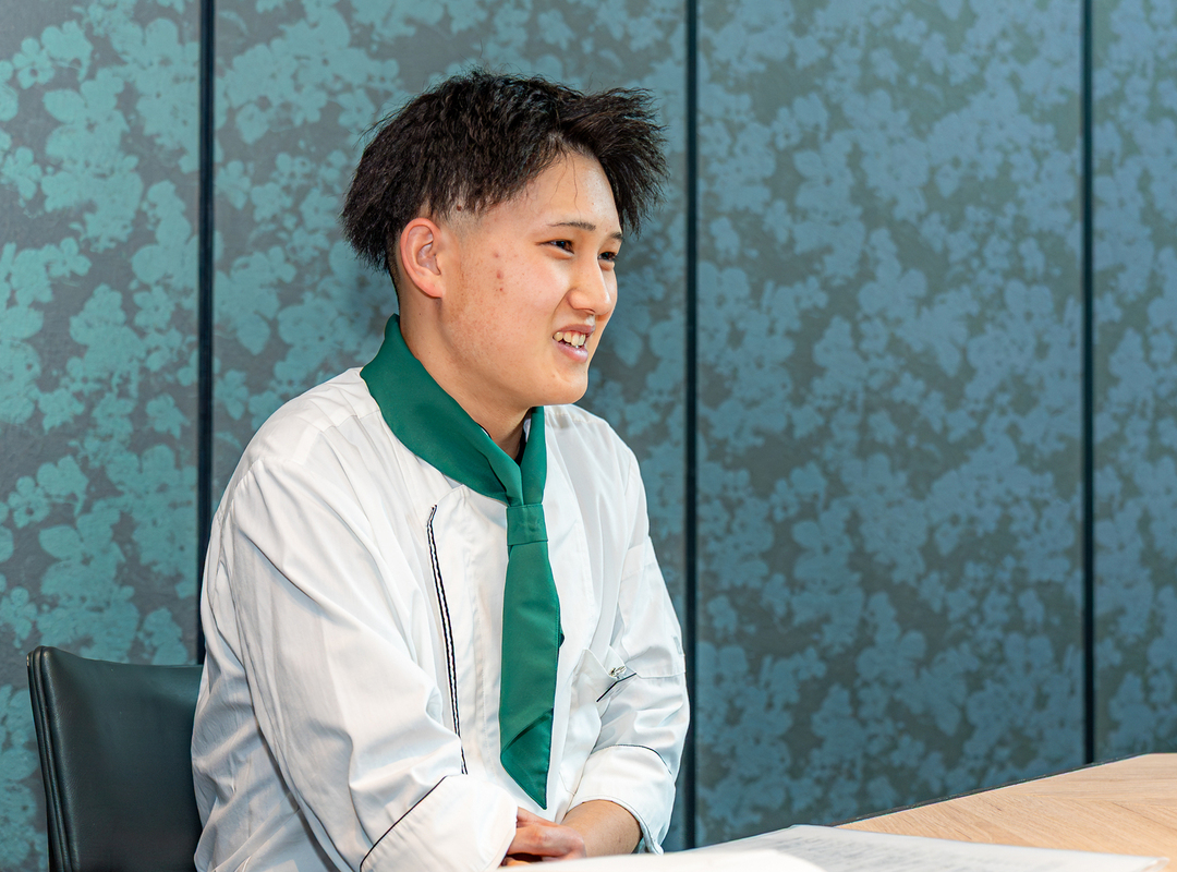 小学生の頃から料理をするのが好きで、から揚げや卵焼き、オムライスを自分なりに工夫して作ってました。我流だったので失敗も何度もあったんですが「料理って楽しいな」と思ったのが調理師を目指したきっかけです。高校卒業後の進路を考えた時に、早く現場で経験を積みたくて就職を選択。求人を調べる中で、ビュッフェ形式でも本格的な料理を提供している当ホテルに惹かれ、「ここなら成長できる」と感じて入社を決めました。将来はフレンチのお店を出す夢もあり、そのためにも今のうちにジャンルを問わず幅広い調理や、それぞれの盛り付け方など様々な経験を積んいきたい!と思っています。
