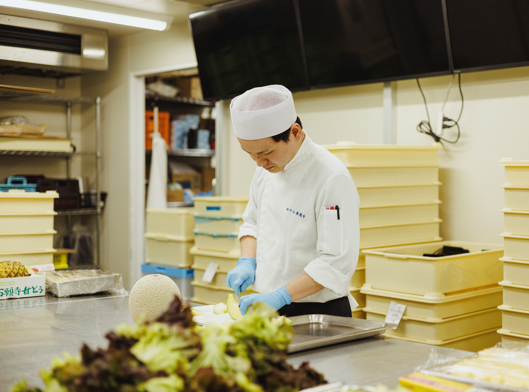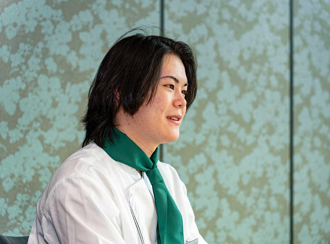 ホテル本能寺のリニューアルオープンに加わったのは、新しい厨房をゼロから立ち上げる経験をしてみたかったからです。準備室を整え、まっさらなフロアに機材を何台入れるか、配置をどうするか、什器を何にするかを検討し、修学旅行向けのメニューも一から組み直してきました。オープンから一年ほどたち、副料理長の話をいただいたときは正直驚きましたが、不安よりも「このチャンスを成長につなげたい」という気持ちが勝ち、引き受ける決断をしました。厨房では最年少の立場ですが、先輩たちの支えを受けながら、新しい挑戦ができていることに感謝しています。