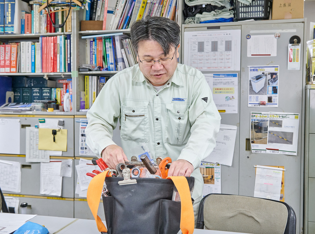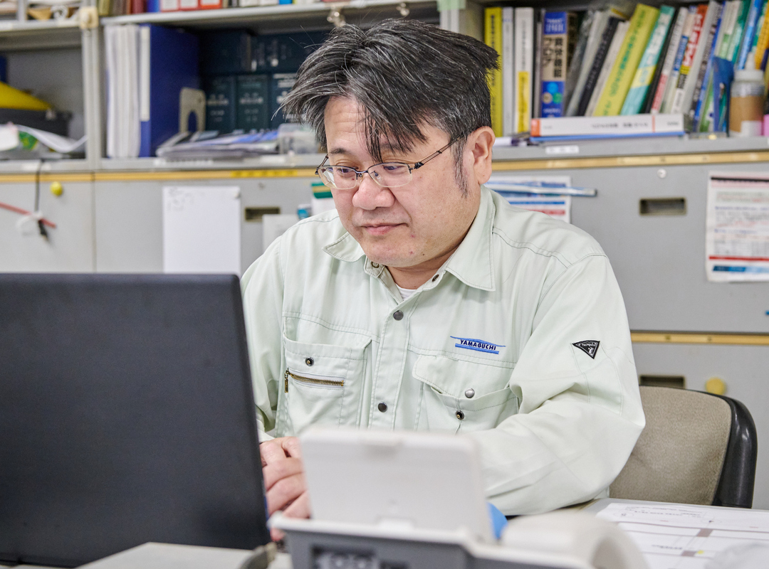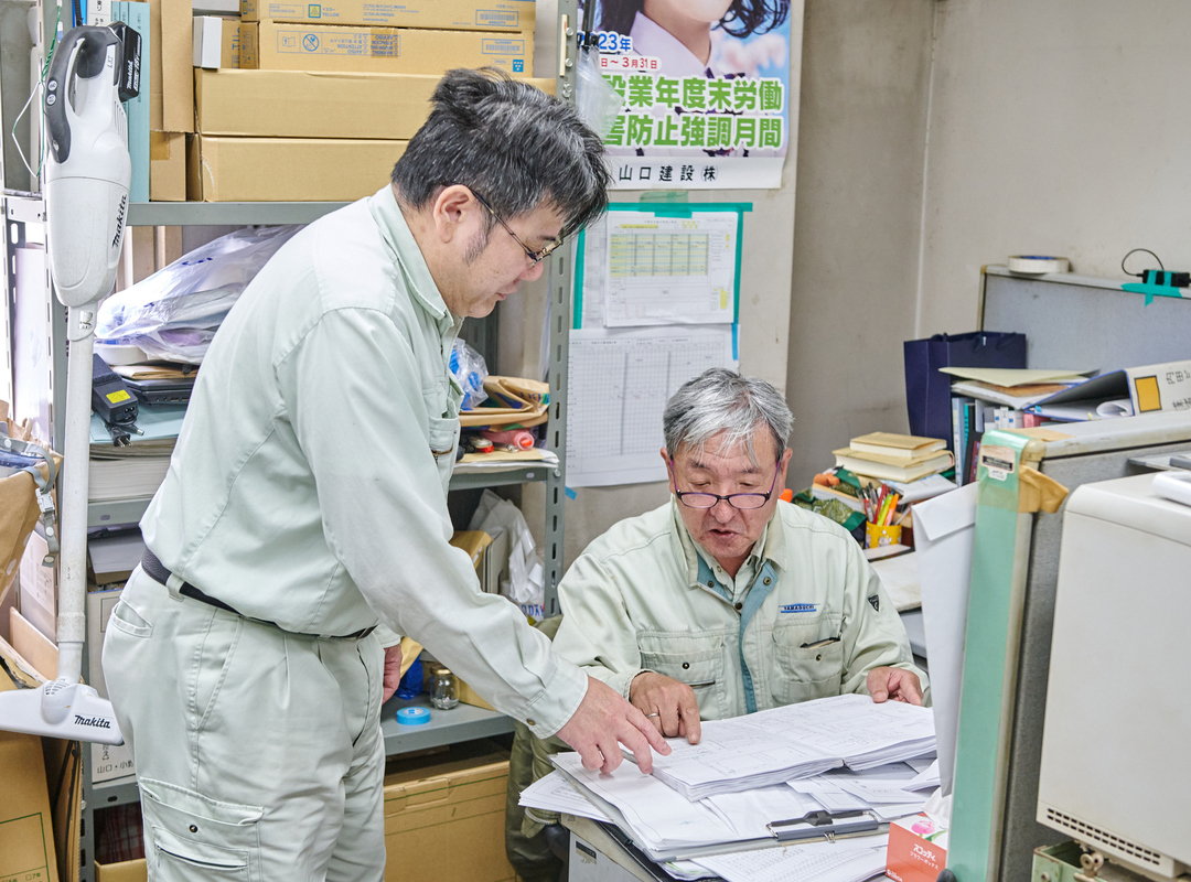 仕事をする上で大事なのは、一人で思い詰めないことだと思います。私が若手の頃、「自分で全部やらなければ」と抱え込んでしまい、ストレスが溜まってしまった時期がありました。当時、一緒の現場で仕事をしていた先輩から「これだけ人がいるのに、なぜ任せないんだ」と言われ、その言葉で考え方が変わり、うまく切り替えることができるようになりました。現在、工事部には7人の経験豊富な先輩社員が在籍しているので、一人で悩まず困ったときは何でも相談してほしいです。上下関係にとらわれず話せるアットホームさが山口建設の良さの一つです。親子ほど年の差があっても話しやすい雰囲気だと思いますので安心してください。
