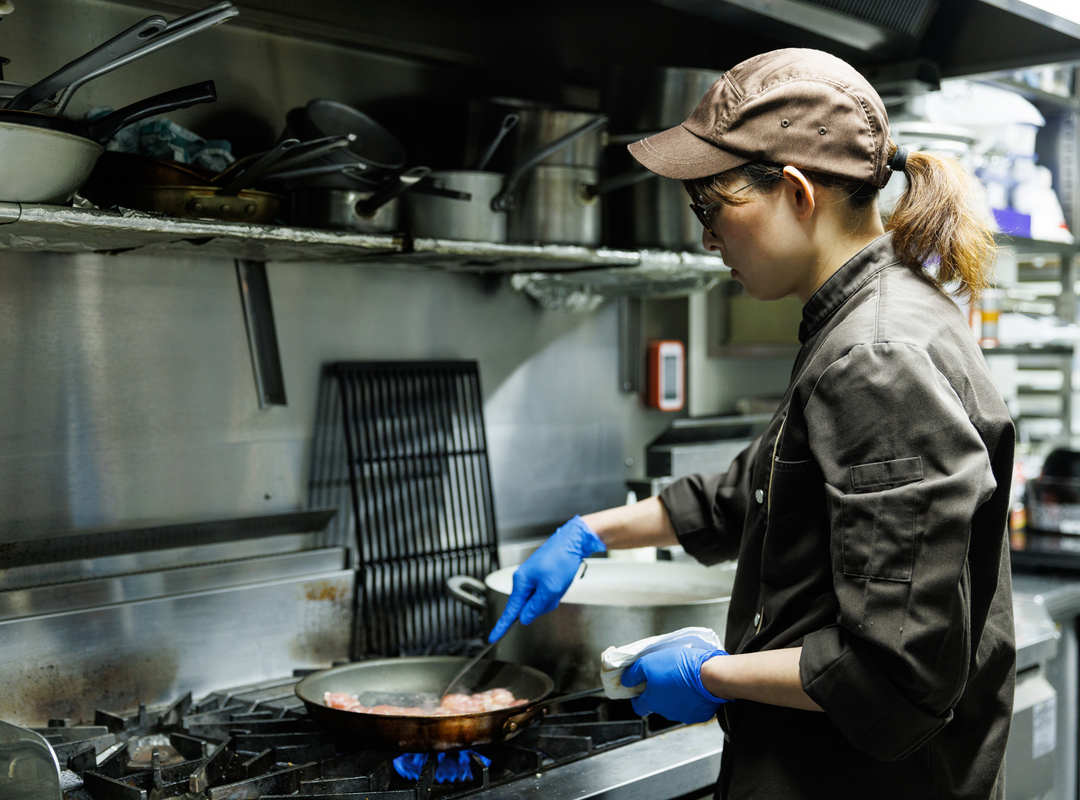 調理全般、肉の掃除、野菜カット、スープの仕込み、前菜の盛り付け、揚げ物や火入れと発注です。