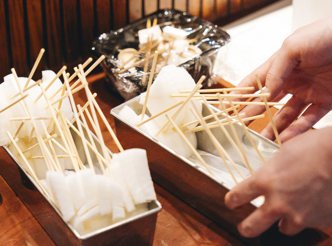現在は、揚がった串に最後の仕上げを施し、お客様に提供する役割りを担当しています。例えば生ハムを添えたり、大根おろしや白髪ねぎをのせたりと、一手間加えることで料理として完成させていきます。串をお出しするときは、はじめに中の具をお伝えしないのが「あーぼん流」。お客様に想像していただくことで、その後の食事や会話がさらに楽しいものになるため、串を置く動作一つにも一切気が抜けません。お客様の反応や食事のスピードを確認しながら、スタッフ全員が「いま、なにができるか」を常に考えて動く。大変ではありますが、目の前のお客様に喜んでいただけるやりがいは格別です。