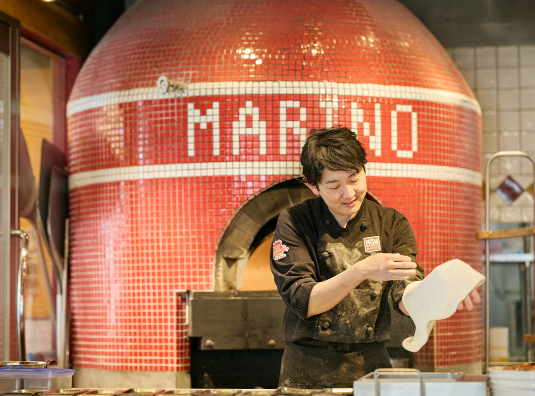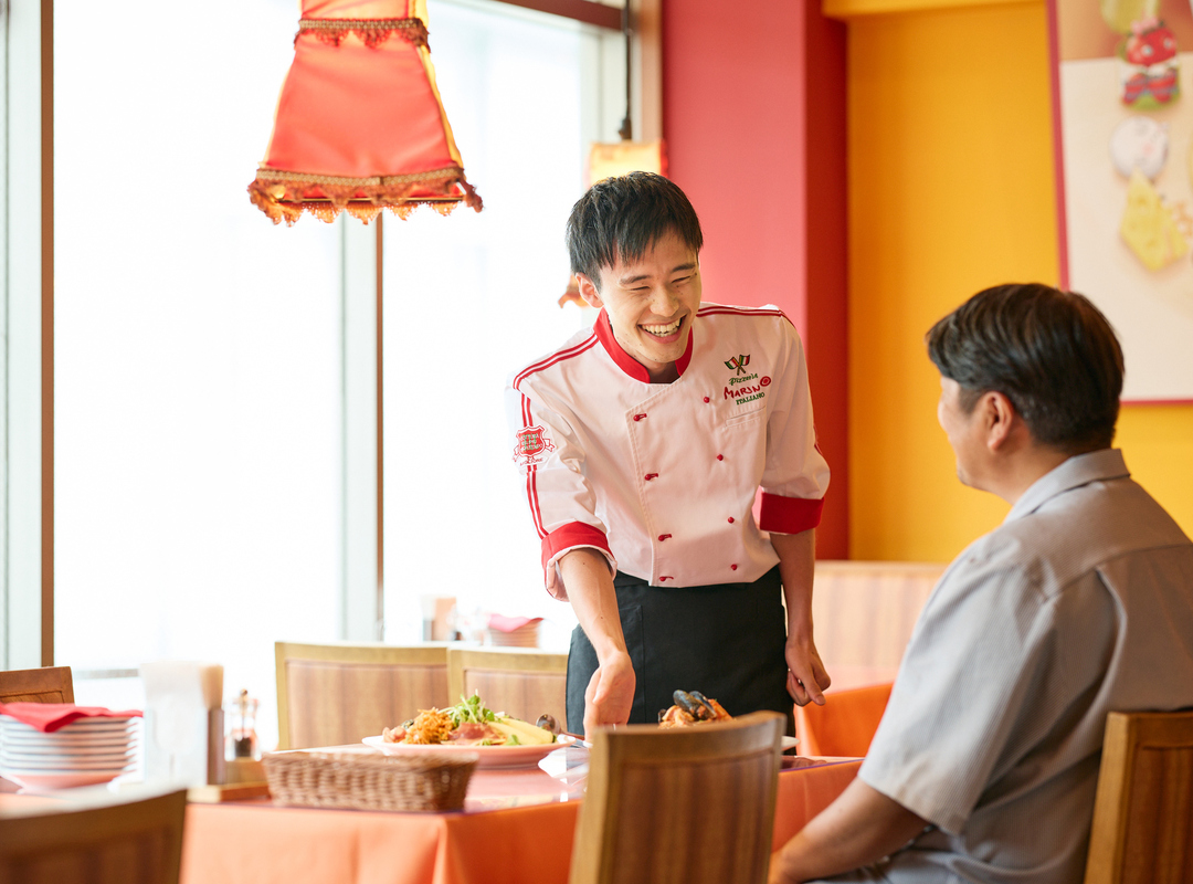 現在は、接客、調理だけでなく管理業務も担当しており、発注業務やシフト作成などのデスクワークも行っています。ピッツァのアクロバットやバルーンサービスなどのパフォーマンスでお客さまを笑顔にできた時や、地域のイベントや催事に参加し、食を通じて地域のみなさまに必要とされた時は、とてもやりがいを感じます。理念にもある『美味しく楽しく』を実践し、お客さまも仲間も自分も含め、笑顔がいっぱい溢れる場所で働けていることが、なにより幸せです。