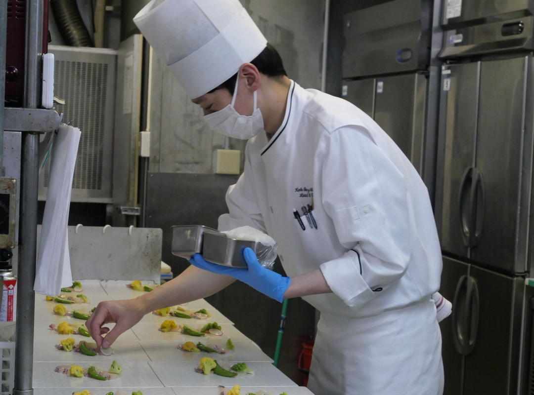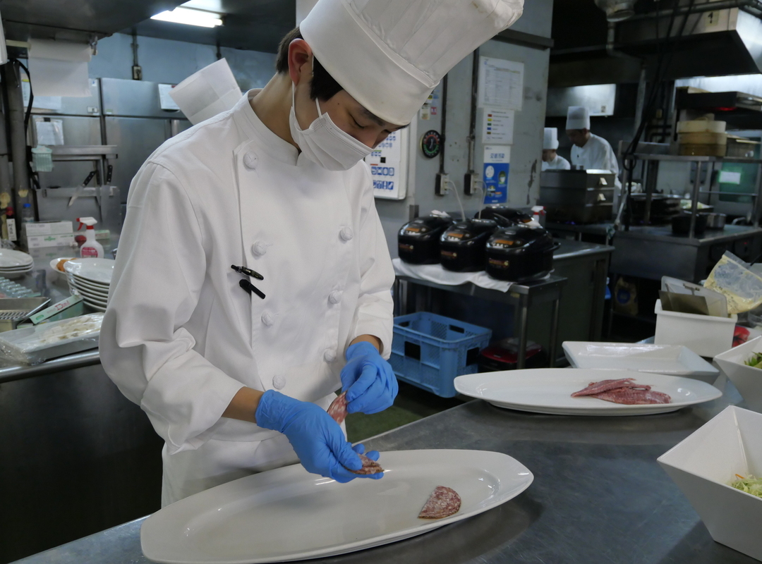 現在の仕事内容は、「ビュッフェの刺身」や「コール物の盛り付け」や「名種サラダのカット」や「惣菜の火入れ」などを行っております。