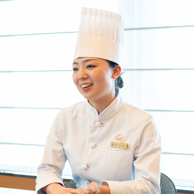 もともとお菓子作りが好きな私は、友人に誕生日ケーキや焼き菓子をプレゼントすると笑顔になる瞬間が嬉しくて、製菓の専門学校へ進学しました。就職先に関しては、現在の上司であるシェフが専門学校に講師として来校されたのがきっかけです。シェフの技術を間近で見て興味を持ち、「ショップに並べるケーキのほか、結婚式や大きなイベントが多く、デセール(お皿盛りのデザート)など幅広い種類のお菓子作りに携わることができる」「高級食材や旬のフルーツを使い自分の舌で味わえ、ラグジュアリーホテルならではの経験ができる」という話を聞き入社を決めました。現在は焼き菓子全般と米粉のロールケーキを担当しています。