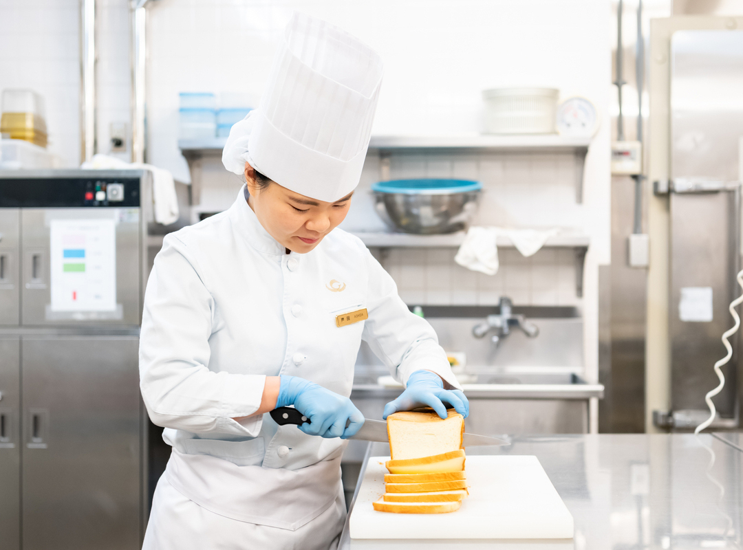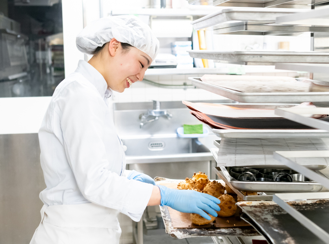 ペストリーは16名ほど在籍しており、スタッフ同士の仲がよく、先輩方はやさしく教えてくれます。私も先輩に教わりながら、少しずつできる業務を増やしていきましたが、自分から教えてもらいにいくことが重要だと学びました。私自身、最初は積極的なタイプではなかったのですが、自分から進んで動いた方が早く自分の技術になり、教えてもらえるチャンスも増えます。今は教える立場になり、私が新人のとき先輩にしてもらったように後輩が困っていたら助けてあげたいです。それから、単に「これがダメ」と言うのではなく、理由や根拠を説明できるようになりたいので自分の中でしっかり理解したいと思っています。