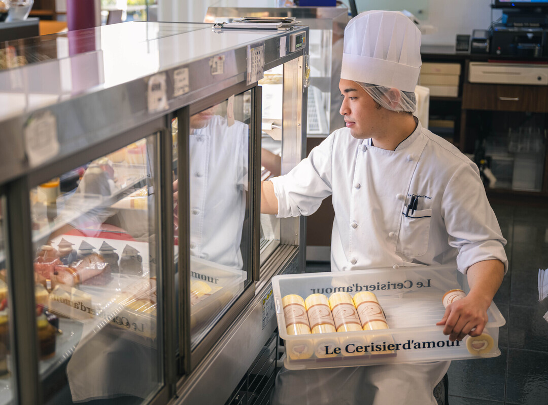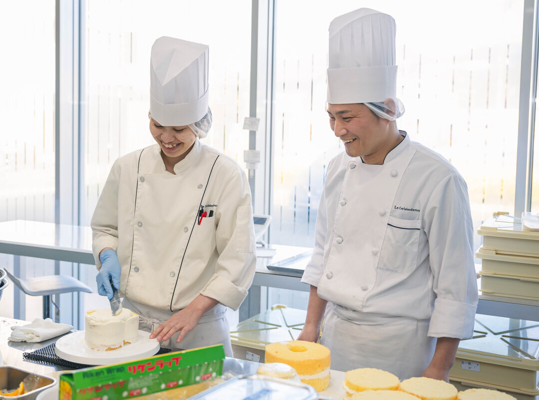 私がお菓子づくりに興味を持ったのは高校生のときです。クラスの仲間と持ち寄りパーティーをした際、スイーツ担当としてチーズケーキを作ったことがきっかけ。お菓子づくりの楽しさを知り、パティシエを目指すようになりました。ル・スリジェダムールを志望したのは、専門学校在学中、講師として来校された上野専務の話に心が動いたからです。他の社員の方もたびたび授業に来て下さり、有名で規模は大きいけれど“身近なパティスリー”という印象があったことが入社の決め手に。休日や待遇面など労働環境が整備されている点にも安心感があり、ここで頑張りたいと気持ちが固まりました。