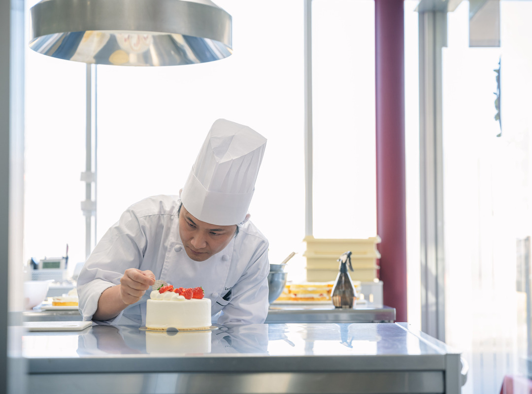入社後に配属されたのは、ケーキのスポンジやクッキー、ムースなどを手掛ける洋菓子工房です。最初は道具や材料の準備・計量など、基礎的な仕事に従事。仕事の合間に先輩から仕込みや焼き具合などを教えていただき、段階的に幅広く、業務全般を覚えていきました。一年ほどでひと通りの工程を知ることはできましたが、技術として“身についた”というレベルになるにはまだまだ修行が必要だと実感。言語化しにくい感覚は、先輩の仕事を間近で見て、聞いて、実際にやってみることで、体感に落とし込めるよう努力しました。みずから積極的に学ぶ姿勢に加え、面倒見の良い先輩に恵まれたことが成長のバックボーンになったと感じています。