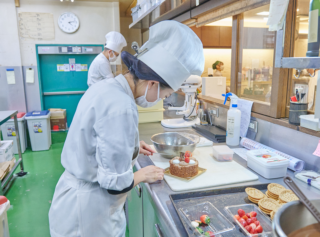入社して2年ほどは基礎をみっちりと。最初はスピードも遅かったと思いますが、3~4年目くらいからメニュー考案を任せてもらえるようになりました。宇治茶と季節を感じる素材を使うことを意識して考えています。心が折れそうになったこともありますが、やっぱりパフェを考えたり焼き菓子を作ったりするのは楽しい!それをお客様が喜んでくれたら嬉しいですし、続けてこれたのだと思います。新しいメンバーに指導することも多いのですが、スピードよりも丁寧にと伝えています。お客様は「都路里のパフェ」を食べに来ているので、ご期待に添うように作ってほしい。最初は地味で単調な仕事も多いかもしれませんが、心掛けてほしいと伝えています。