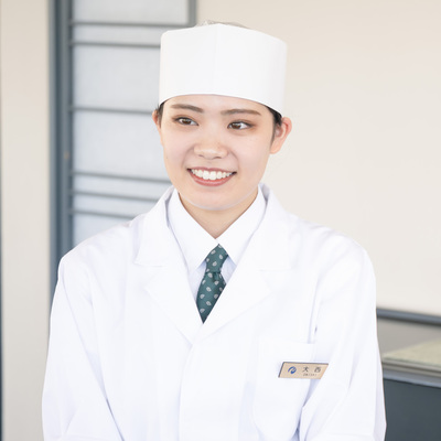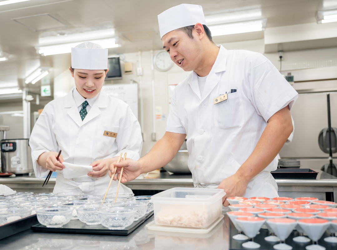 仕事をするうえで心がけているのは、“目にするもの、耳にするものは全部吸収しよう!”という気持ち。自分の事だけに集中するのではなく、“今・誰が・何をしているか”常に気を配り、先輩の仕事を見ながら、盛り付けや魚の卸し方のコツを学んでいます。また、見てもわからないこと、疑問に思ったことは、すぐに質問。入社前は勝手に、(和食の料理人さんは怖そう)と思っていましたが、職場の先輩たちはすごく優しいので、何でも聞くことができてありがたいです。また、研修でお世話になった部署の方が声をかけてくれるなど、組織を超えた交流があることも嬉しいですね。人のあたたかさが自慢の会社です。