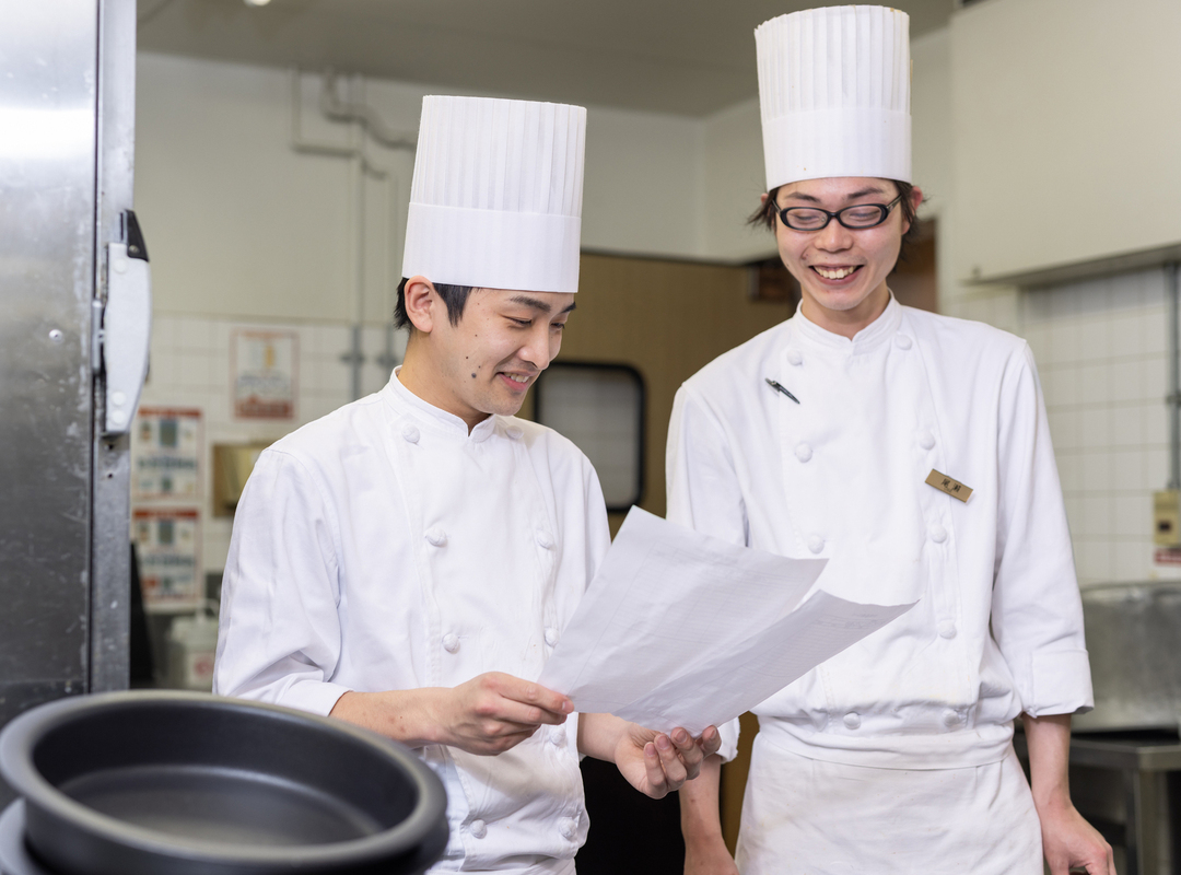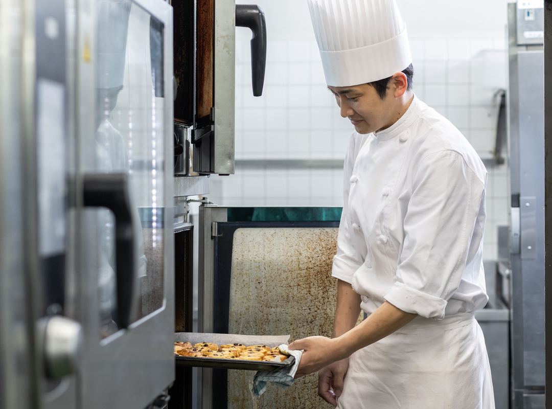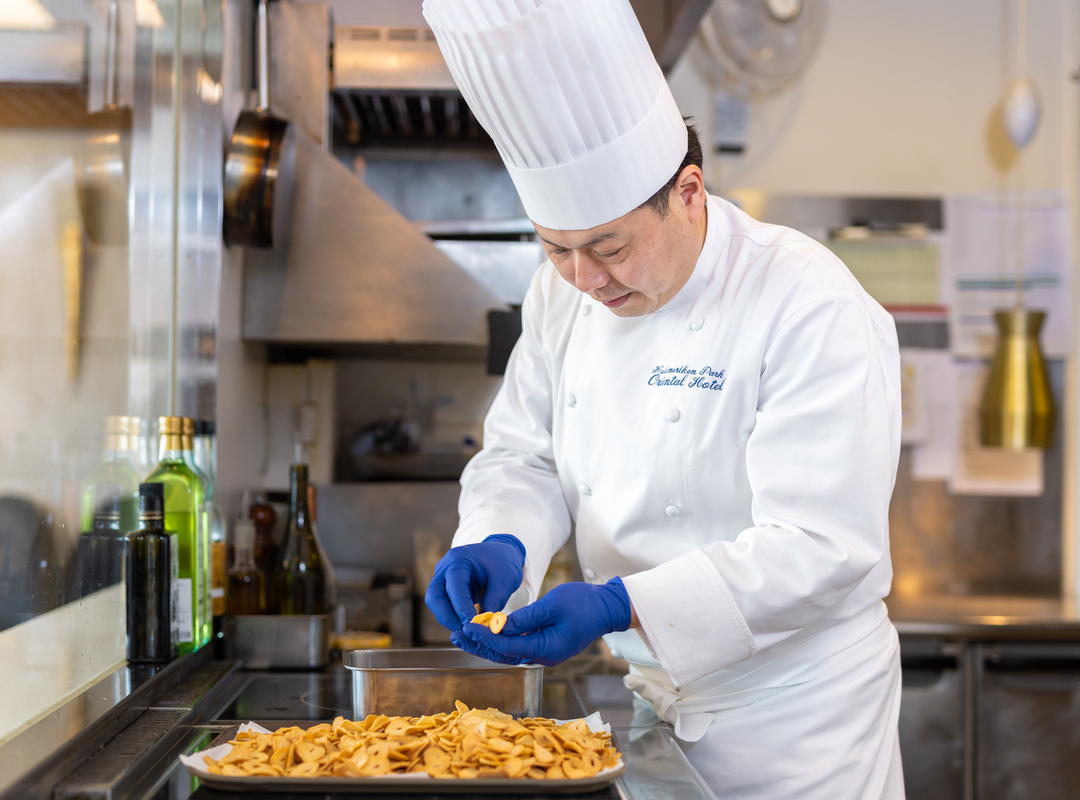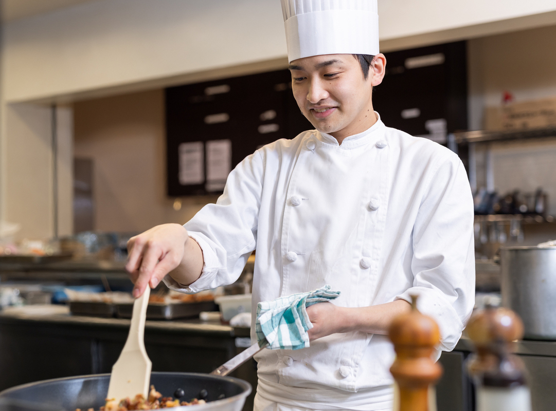 2021年、オリエンタルホテル ユニバーサル・シティのオープンに際し、調理・サービスの責任者を務めさせていただきました。調理とサービスを一つのセクションとして扱うのは会社としても初の試み。サービスに関しては私も改めて学ぶことが多く、勉強になりましたし面白かったです。印象深いのは、修学旅行のメニュー考案を担当したこと。限りある予算の中で、ゲストにとって一生の思い出に残る食事を、ドリアやご当地メニューのたこ焼きを取り入れたり、試行錯誤を重ねました。おかげさまで好評をいただいており、料理人冥利を感じています。
