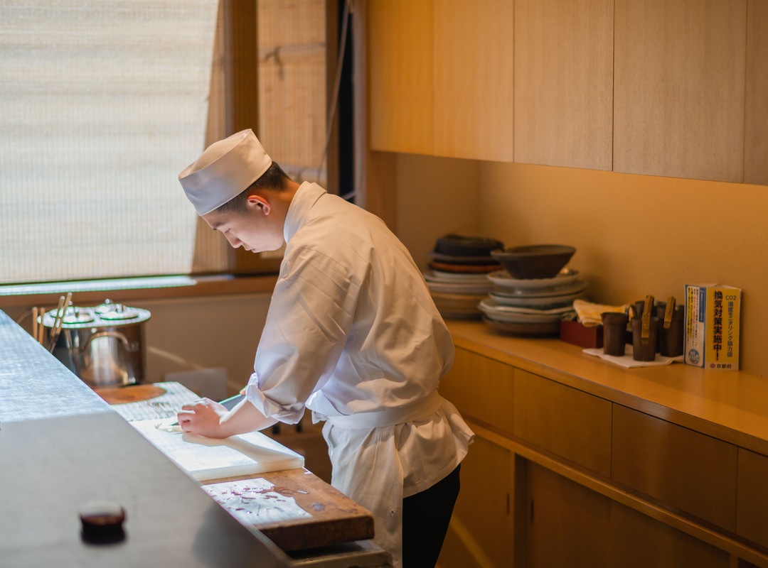 親が料理人なので、その背中を見ながら料理人になりたいと思っていました。そのときは京都で働きたいと思っていたので、紹介していただき当店で働けることになりました。実家はちゃんこ鍋をメインでしていたので、規模も大きくコースがメイン。一方当店はカウンターと座敷を合わせても30席程度で、割烹料理は一品料理が主なので、丁寧に仕事ができます。マニュアルがなく即興対応ということがほとんどなので、料理の技術も磨かれますし、人の気持ちを考えるという技術も必要。人間的にも成長できる職場だと思います。常連のお客様が多いので、厳しくも大目に見てくださるのも魅力だと思います。