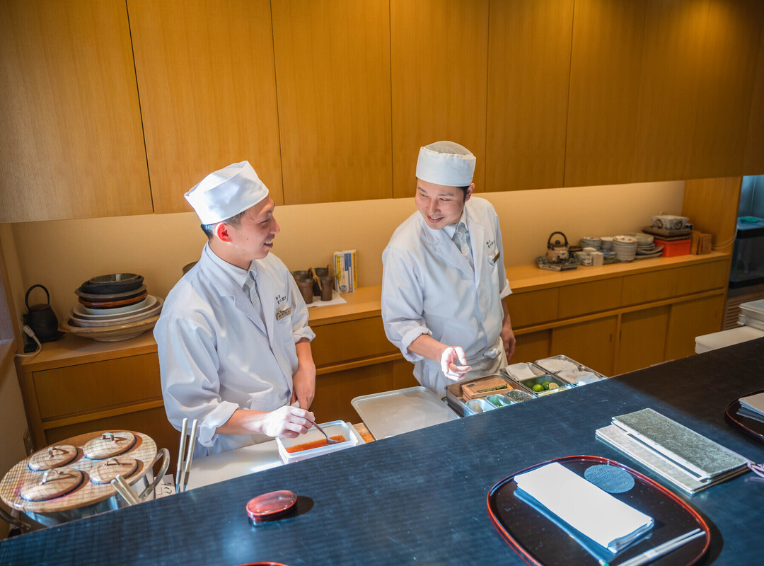 お店それぞれでやり方がありますし、お客様にあわせて柔軟に対応する必要があります。当店はご年輩のお客様も多く、経験を積まれた大人の成功者の方ばかり。だからこそ温かく見守っていただける部分も多く、お客様に育てていただいています。たとえ未熟でも、技術だけでなく思いの部分をしっかりと評価してもらえます。煮方から花板へ昇格したときには、お客様から包丁を贈っていただくというとても光栄な経験もできました。当店は料理人が皆協力してお客様満足のためにお客様の方をしっかりと見ている職場です。料理人同士がいがみ合うなんてことは無縁で、居心地が良い環境だと思います。