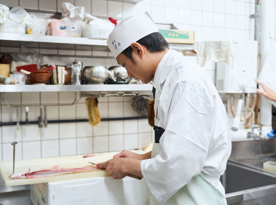 当店では1年目から魚を触り、調理にも積極的に関わります。クエなど日常の料理で使わない魚を捌くことができるのは魅力ですね。味付けはもちろん、おしぼりを出すのも接客も、役職に関係なく全員で担当。だからこそ、目利きの力も自然と身につき、魚の旬や調理法、接客のコツまでバランスよく学べる環境です。とはいえ、簡単な道ではありません。魚は季節のものが多く、1年に1シーズンしか触らないことも。「2年目でようやく少し身についてくる」と実感しています。集中して調理しながらも、常客席にもアンテナを張る。その両立には苦労もありますが、おいしく作れたときの喜びはひとしおです。