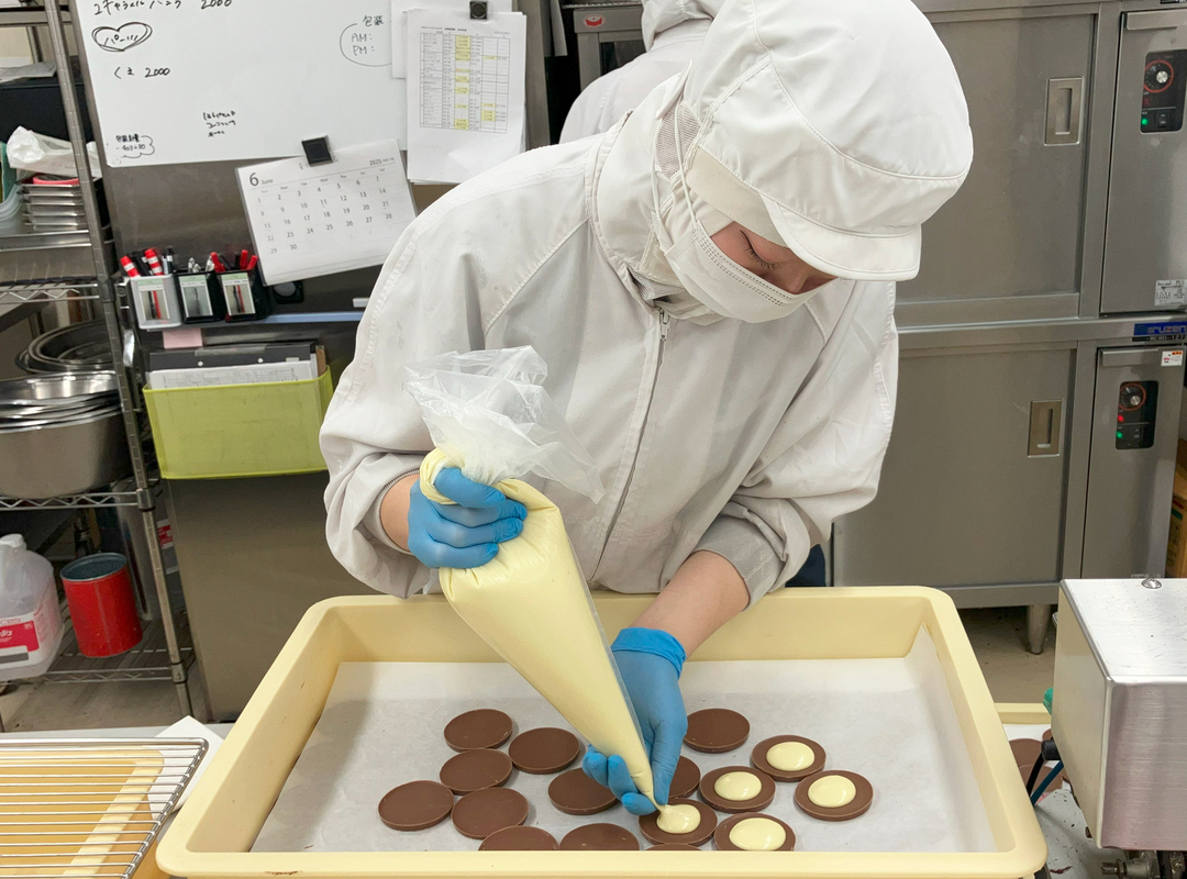 仕事内容は、お菓子の製造や包装等に携わらせてもらっています。