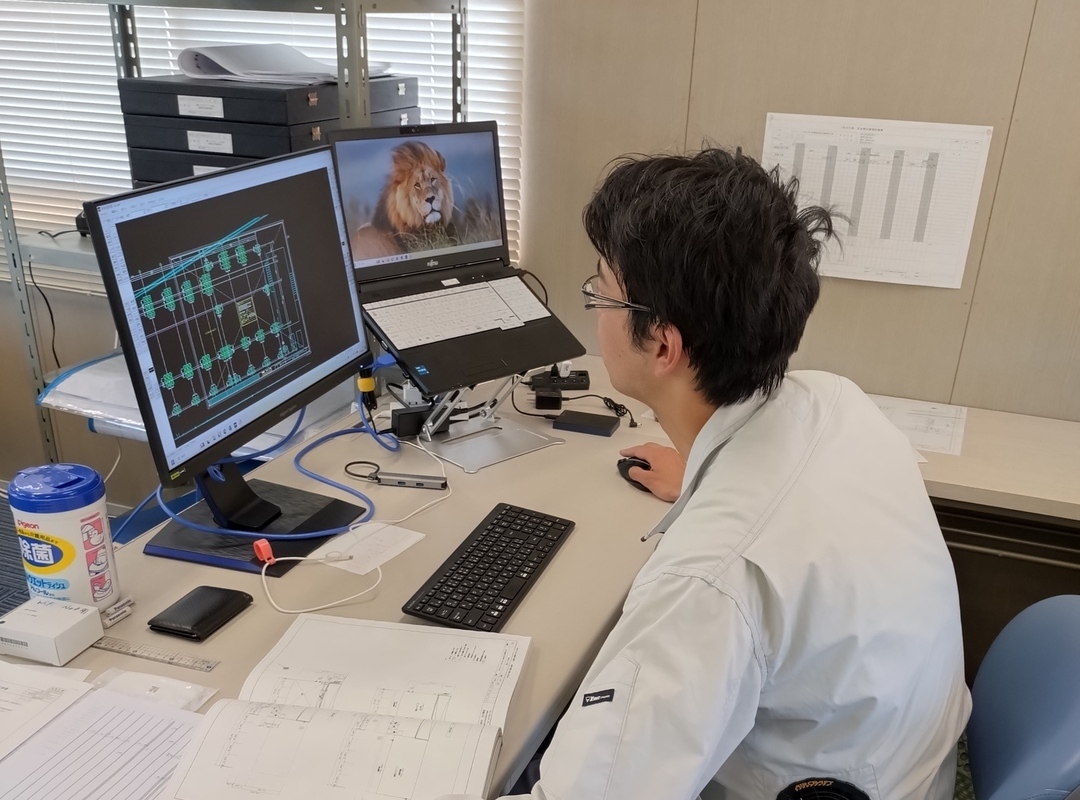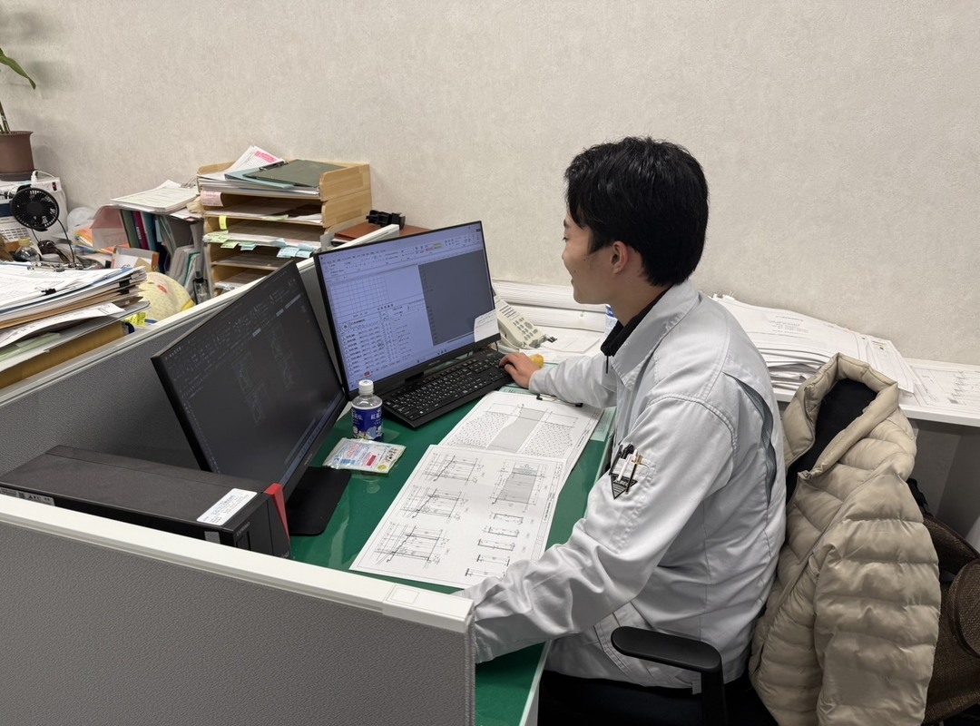 私は建設プロジェクトにおいて、施工図の作成・修正や各種製作図のチェックが主な作業です。施工図は設計図をもとに、実際の工事を進めるために必要な図面であり、現場の職人さんがスムーズに作業できるよう細かい部分まで確認しながら作成しています。当社の魅力は、実際の施工現場に近い環境で仕事ができることだと思います。現場の事務所などで業務を行うことも多く、図面だけではわからない現場の動きや知識を実際に学びながら仕事ができるため、幅広い経験を積むことができます。また、さまざまなプロジェクトに関わる機会があり、仕事を通して専門知識やスキルを身につけながら成長を実感できる点も魅力です。